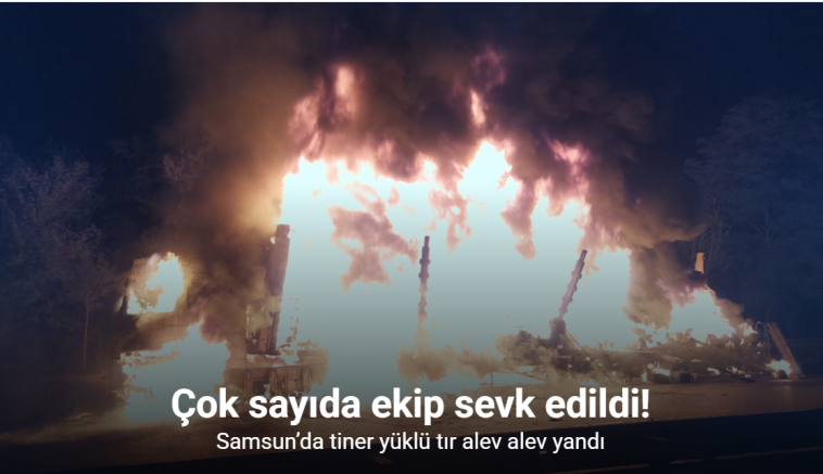 Samsun’un Atakum ilçesi Samsun Ankara kara yolu Sarıışık mevkisinde tiner yüklü bir tırda seyir halindeyken yangın çıktı. Tırın dorsesinden yola saçılan tiner kutuları yanmayı sürdürürken, bir süre ilerleyen tır durarak tamamen yanmaya başladı. Alev topuna dönen tırda zaman zaman tiner kutuları patlarken, yangın yerine itfaiye, polis ve ambulans sevk edildi. Samsun-Ordu ve Samsun-Ankara kara yolu araç ve yaya trafiğine kapatıldı. Samsun Büyükşehir Belediyesi İtfaiye Daire Başkanlığı ekipleri yangını söndürmek için seferber oldu.