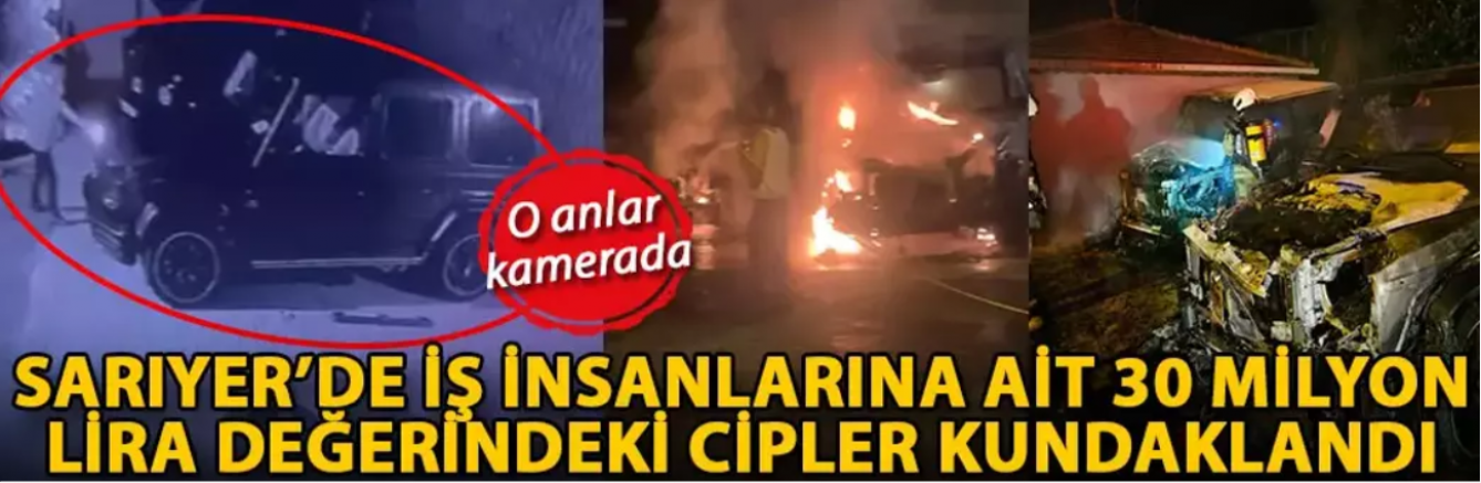 Park halindeki, iş insanı Karin O.'ya (54) ait 34 K 7770 plakalı cip ve iş insanı Gürkan T.'ye (64) 34 RP 2222 plakalı cipin alev alev yandığını görenler, durumu 112 Acil Çağrı Merkezi'ne bildirdi. İhbar üzerine olay yerine gelen itfaiye ekipleri yangını söndürdü.