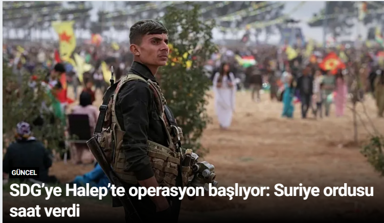 Suriye ordusu, Halep kent merkezinde terör örgütü SDG’ye yönelik yeni bir operasyon başlatacağını duyurdu. Yapılan açıklamaya göre, Eşrefiye, Şeyh Maksud ve Beniy Zeyd mahallelerinde saat 13.30’dan itibaren SDG mevzilerine nokta atışı operasyonlar gerçekleştirilecek.