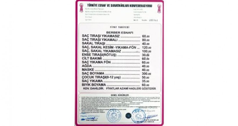 Artan maliyetler ve dükkân giderlerinin yükselmesi nedeniyle Sinop'taki berber esnafının zora girdiği belirtilerek yeni zamlı tarife Sinop Esnaf ve Sanatkârlar Odası tarafından onaylandı. Yeni tarifeye göre sadece saç tıraşı yıkamalı ve yıkamasız olarak 60-80 TL, sakal tıraşı 40 TL, saç ve sakal tıraşı 100-120 TL, çocuk tıraşı 50 TL, ense tıraşı 30 TL, saç yıkama ve fön ise 60 TL olarak belirlendi.