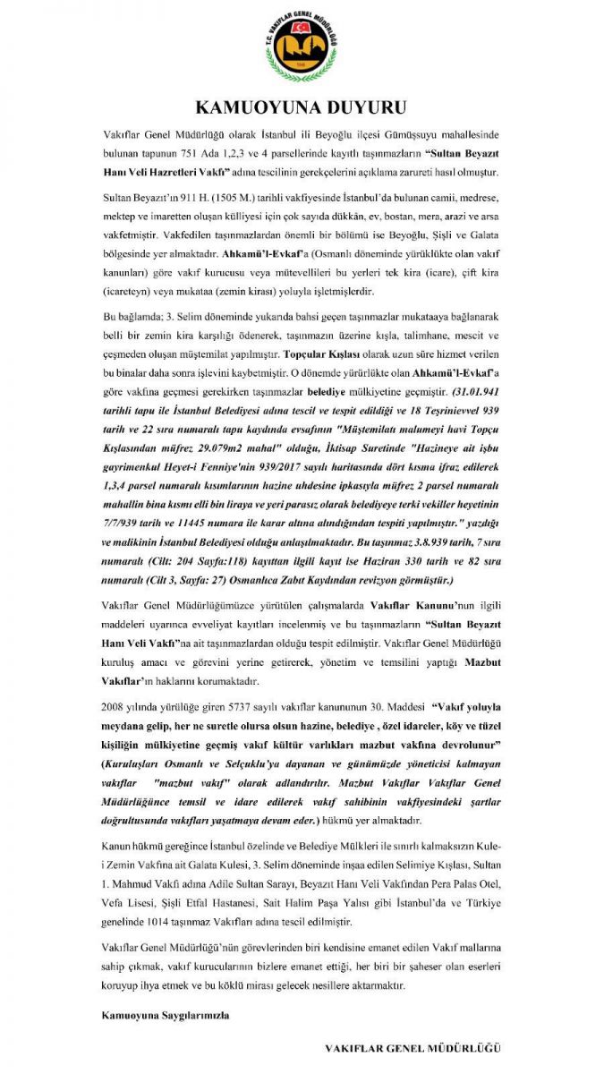 Yazılı açıklamada, İstanbul'un Beyoğlu ilçesi Gümüşsuyu Mahallesi'ndeki 751 ada 1, 2, 3 ve 4 parsellerinde kayıtlı taşınmazların Sultan Beyazıt Hanı Veli Hazretleri Vakfı adına tescilinin gerekçelerini açıklama gereği duyulduğu belirtilerek, şunlar kaydedildi: