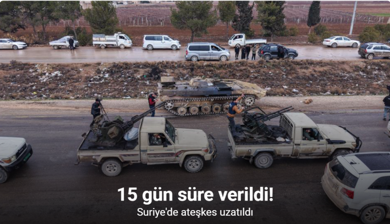 Suriye Savunma Bakanlığı, Suriye ordusu ile terör örgütü PKK/YPG'nin Suriye uzantısı SDG arasındaki ateşkesin ateşkesin 15 gün süreyle uzatıldığını açıkladı. Suriye Savunma Bakanlığı Medya ve İletişim Dairesi'nden yapılan açıklamada, ateşkesin bugün saat 23.00 itibariyle tüm Suriye ordusu operasyon bölgelerinde geçerli olmak üzere uzatıldığı belirtildi. Söz konusu kararın, DEAŞ tutuklularının Irak'a sevkine yönelik ABD öncülüğünde yürütülen operasyona destek amacıyla verildiği belirtildi.