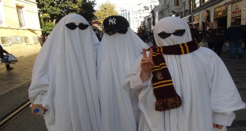 Taksim'de hayalet kostümlü 3 kadına vatandaşlar yoğun ilgi gösterdi.