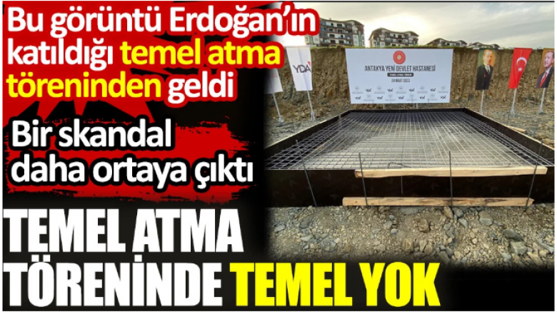 Cumhurbaşkanı ve AKP Genel Başkanı Recep Tayyip Erdoğan, dün Hatay'ın İskenderun ilçesinde deprem konutları ve temel atma törenine katıldı. Defne Yeni Devlet Hastanesi'nin temel atma töreni görüntüleri sosyal medyaya yansımasının ardından çimento dökülen alan kaldırılmıştı. Fotoğrafta, beton dökülen alanın aslında temel olmadığı, küçük bir alanın demirlerle çevrildiği ve etrafında başka bir şey olmadığı görülmüştü.